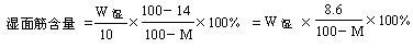 1、濕面筋含量是以每百克含水量為14%的小麥粉含有濕面筋的克數(shù)來(lái)表示的,如每百克試樣含水份克數(shù)為M(g),試樣質(zhì)量為10g,而濕面筋(包括篩上面筋和篩下面筋)稱得質(zhì)量為W濕(g),則濕面筋含量可按下列公式計(jì)算: