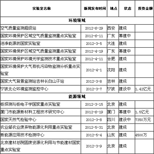 在這四十五家的實(shí)驗(yàn)室中,糧油儀器網(wǎng)發(fā)現(xiàn)有多家制造商廠商斥巨資設(shè)立研發(fā)中心,以下為2012年上半年我國環(huán)境、能源及其他領(lǐng)域的實(shí)驗(yàn)室建設(shè)情況: