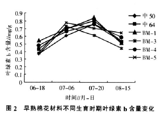 圖二 棉花材料不同生育時期葉綠素b含量變化