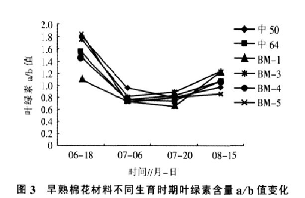 圖三 早熟棉花不同生育時期葉綠素含量a/b值變化
