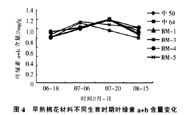 通過利用葉綠素計研究不同材料葉綠素的動態(tài)變化,試驗結(jié)果顯示不同棉花早熟新材料之間, 在整個生育期中,葉綠素變化有規(guī)律可循,結(jié)合材料抗性、產(chǎn)量和吐絮期早熟不早衰鑒定,可以通過不同材料的葉綠素含量及比值的表現(xiàn)找到育種新材料選擇的生理生化依據(jù)。通過對對照和4個早熟新材料的葉綠素a、葉綠素b含量、葉綠素a+b含量和葉綠素a/b值的分析,材料 BM-5 在現(xiàn)蕾時葉綠素 a 含量較高,開花時出現(xiàn)葉綠素b含量高峰,說明隨著植株生長,在棉田封行出現(xiàn)遮陰時,材料本身可以迅速啟動自身酶系統(tǒng)將部分葉綠素 a 迅速轉(zhuǎn)化成葉綠素b(或大量新合成葉綠素b)以適應(yīng)環(huán)境的需要。 葉綠素b含量高峰的較早出現(xiàn)可以使材料吸收較多藍紫光,充分利用折射光,形成更多的有機物。 材料 BM-5 在吐絮期葉綠素b含量、葉綠素a+b含量最高,而且葉綠素a/b的值最低,高的葉綠素a+b總量和葉綠素b成分保證了吐絮期棉花植株后期營養(yǎng)來源, 是材料豐產(chǎn)的保證。 通過本研究,我們認為在育種材料選擇中,可以將出現(xiàn)葉綠素b高峰早,吐絮期葉綠素 b 含量高、葉綠素 a+b 含量高和葉綠素a/b值較低作為材料選擇標準。