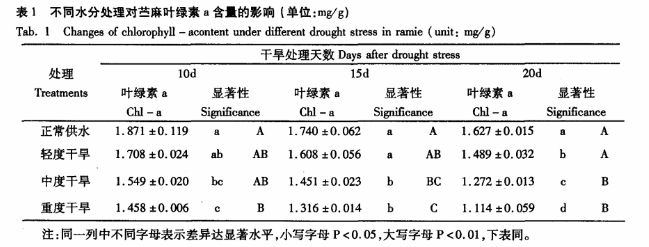 通過葉綠素測定儀的研究并分析表明,干旱脅迫10天、15天時輕度干旱與對照差異較小,不顯著,干旱脅迫20天時差異達(dá)顯著水平,表明干旱的持續(xù)時間對葉綠素a的含量影響較大,即使是輕度干旱脅迫,持續(xù)時間過長也顯著降低苧麻葉綠素a含量。各時間段中度干旱處理和中度干旱處理與對照之間的差異均達(dá)顯著或極顯著水平,表明干旱脅迫的程度對葉綠素a含量具有重要的影響,嚴(yán)重干旱脅迫在較短的時間內(nèi)也顯著降低葉綠素a含量。