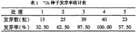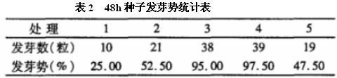通過種子發(fā)芽箱的研究,各處理種子在催芽72小時測定發(fā)芽數(shù),計算發(fā)芽率, 從表1可以看出,處理4發(fā)芽率最高,為100%,處理1發(fā)芽率最低, 為32.50%, 處理2到處理4發(fā)芽率逐漸增大, 分別為 62.50%、97.50% 、100%,處理5發(fā)芽率反而降低,為57.50%。從表2與表1的統(tǒng)計結果可以看出,在處理3和處理4溫度條件下,苦瓜種子的發(fā)芽勢和發(fā)芽率均為最高。