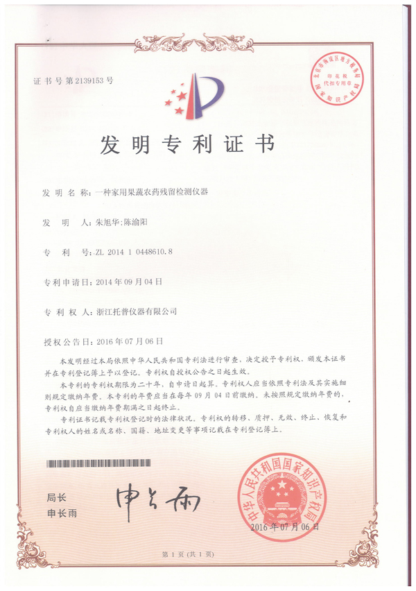 浙江托普云農(nóng)科技股份有限公司(股票代碼:833692)申請(qǐng)的“一種家用果蔬農(nóng)藥殘留檢測(cè)儀器”發(fā)明專利申請(qǐng),已于2016年7月6日獲得中華人民共和國(guó)國(guó)家產(chǎn)權(quán)局頒發(fā)的發(fā)明專利證書。