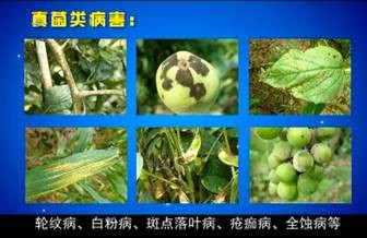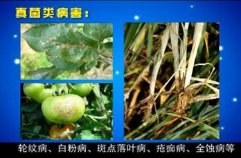 真菌類:灰霉病、霜霉病、猝倒病、枯黃病、立枯病、早晚疫病、莖枯病、蔓枯病、黑星病、黑斑病、銹病、輪紋病、白粉病、斑點落葉病、瘡痂病、全蝕;