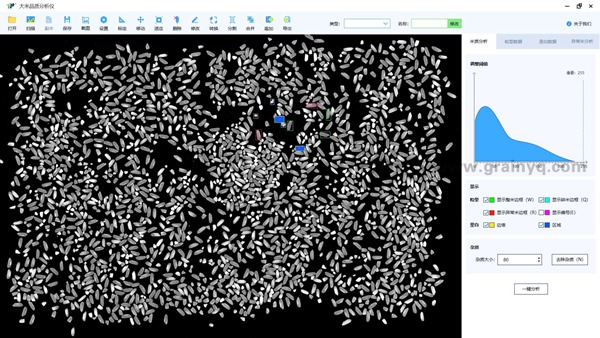 2、單粒米分析:自動(dòng)測(cè)量每粒米的粒型、堊白度等參數(shù),自動(dòng)大批量分析處理與輸出結(jié)果。